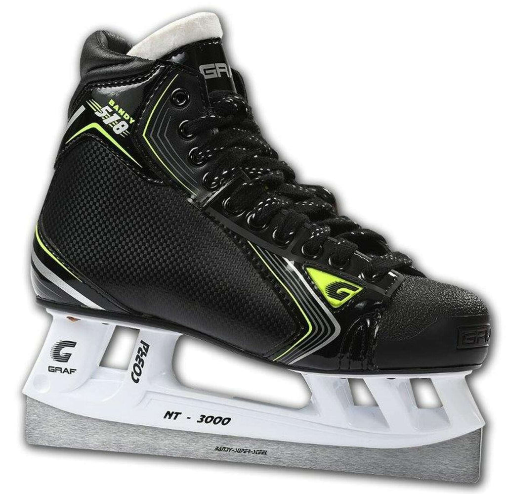 Bandy spelas på en större plan än ishockey och därför blir skridskosparken längre. För en längre spark har bandyskridskonen en lägre främre flik, vilket ger mer rörelse åt fotleden. I Grafs högkvalitativa 518 bandyskridskor ger Carbon-Composite-panelerna stöd och skydd för foten. Skon kan värmeformas för att passa din fot. Asymmetrisk topp. Rostfria Cobra 3000 blad. Storlekar 7-11".