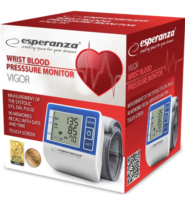 Blodtrycksmätare av handledstyp med tydlig LCD-display och minnesfunktion som visar systoliskt och diastoliskt tryck och puls.