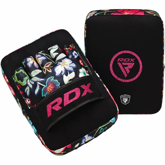 Dessa Floral fokuskuddar är handgjorda för att säkerställa bästa möjliga kvalitet. Ovansidan är gjord av mocka och den har ett syntetiskt Flora Skin-broderi. Insidan är dubbelsydd för att främja rivhållfasthet. Ett tjockt lager av EVA-skum skyddar tränarens och boxarens händer från stötar och förhindrar handledsskador. Det noggrant formade handstycket säkerställer ett snabbt grepp om dynan. Den öppna fingerdesignen främjar luftflödet inuti handen och hjälper till att hålla händerna torra under hela träningspasset.