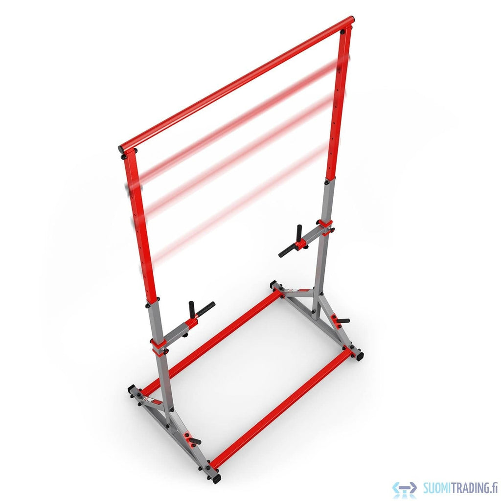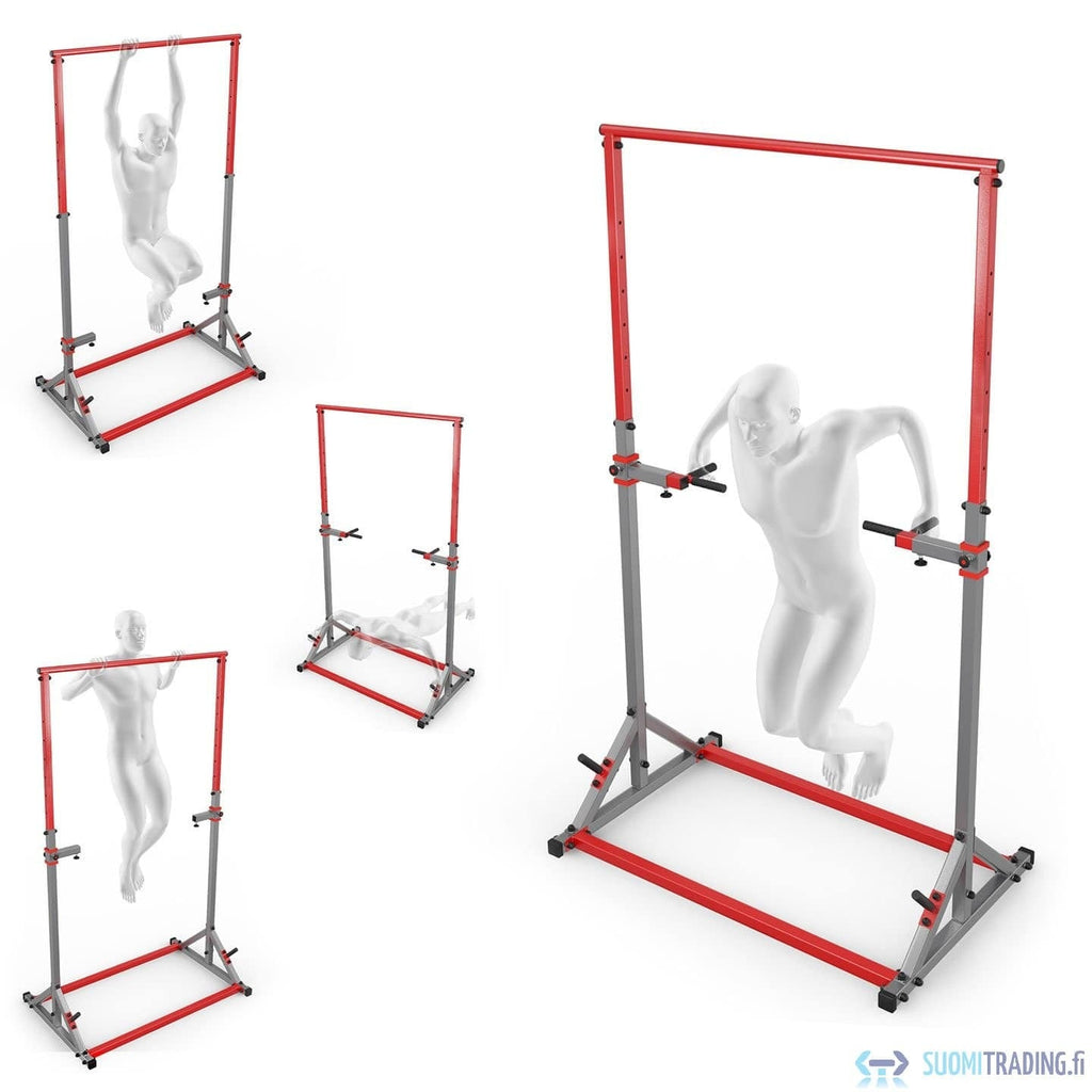 Pull-ups är en mångsidig stärkande rörelse för överkroppen som nu är lätt att träna hemma! Förutom chin-ups kan du prova benlyft som jobbar på magen eller till och med använda en stång för att sträcka på ryggen. Steglöst justerbara dopphandtag. Dessutom har bendelen handtag för armhävningar. Gummibeläggningen på handtagen säkerställer ett stadigt grepp även med svettiga händer.