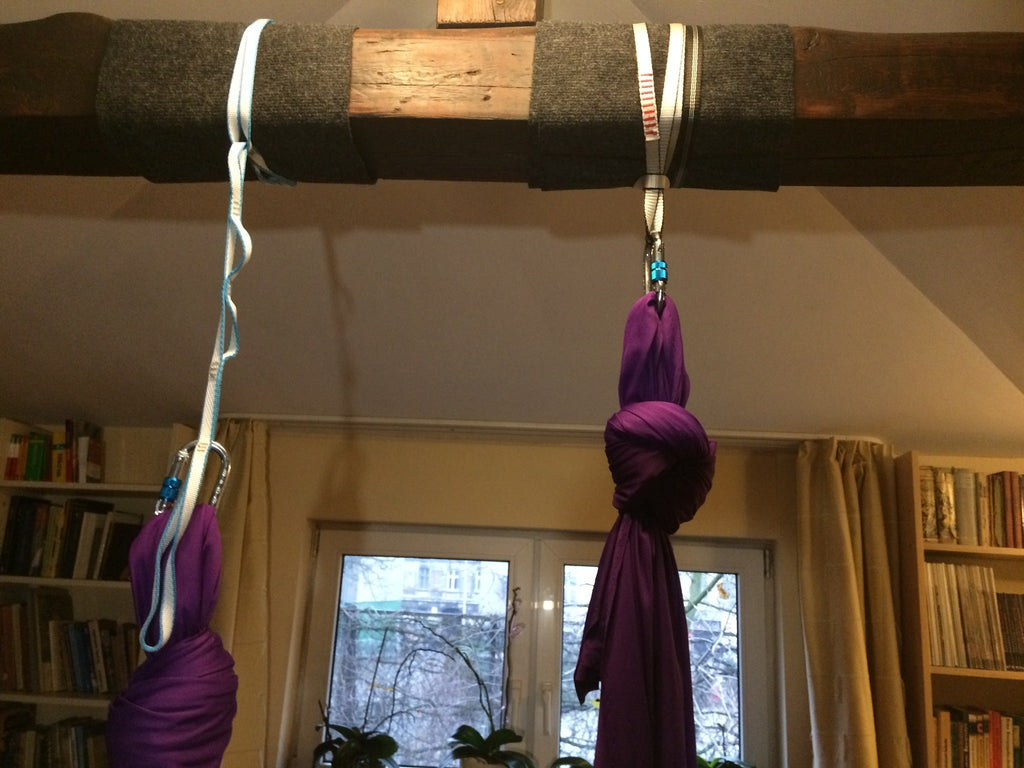 Använd en karbinhake ( säljs separat ) längst upp för att fästa den i din ankarpunkt och fästa en annan karbinhake i en av öglorna, beroende på hur högt du behöver rigga din yogahängmatta eller sele.