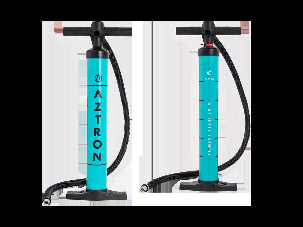Aztron dubbelverkande pump blåser upp din bräda snabbare och enklare med kontinuerliga pumpcykler både nedåt och uppåt. Med en enkel omkopplare kan dubbelverkan enkelt växla till enkelverkande läge för enkel uppblåsning till slutskedet av uppblåsning. Pumpen kommer med en tryckmätare, så att du alltid kan justera din bräda till exakt rätt fyllnadsnivå. Maximalt tryck 20 psi.