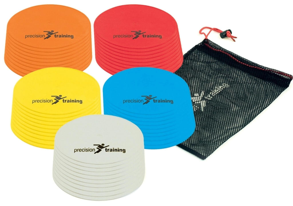 Välj mellan 4 olika färgalternativ. Lämplig för både inomhus- och utomhusbruk. De tunna och lätta skivorna är lätta att ta med till idrottsplatsen eller var som helst. Stapelbara tallrikar tar inte mycket plats. Praktisk förvaringsväska medföljer. Lämplig för hemmabruk, skolor eller idrottsklubbar.
