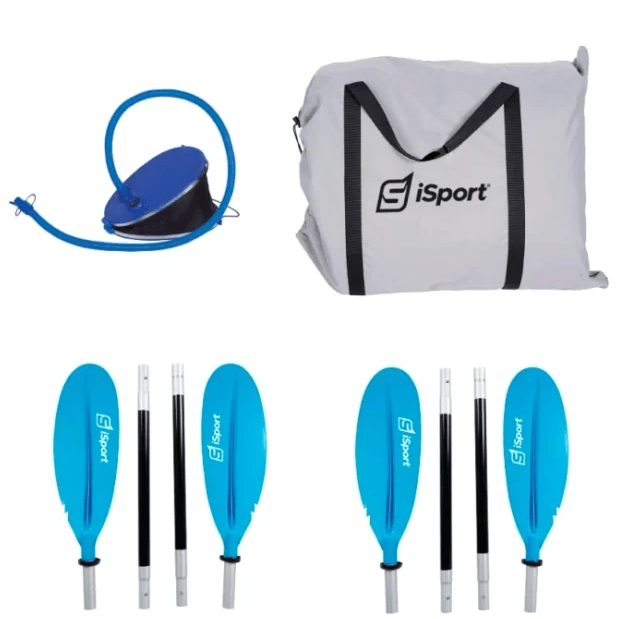Kajaken är packad i en liten väska och är snabb att fylla med den medföljande pumpen. De dubbelsidiga paddlarna kan delas upp i fyra delar så att de kan packas i samma transportväska som kajaken. Kajaken är designad för två personer och har en bärförmåga på 200 kg.