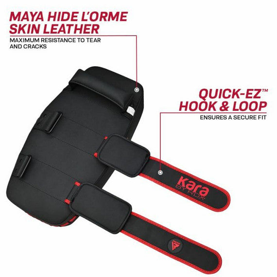 Designed using Maya Hide L’orme Skin leather, these kick pads are impervious to splits and cracks. Calibrated Impact Diffusion SHEET proves to be extremely effective against high impact strikes. DenZo-Tron SHEET is present for added durability and impact resistance. Max-ShockTM Equilibrium Foam is also added to increase product robustness. It evenly distributes the force along the surface of kick pads. Quick-EZ hook-and-loop securely straps the pads on forearms without compromising on comfort. Reinforced stitching promises long-lasting perfection.