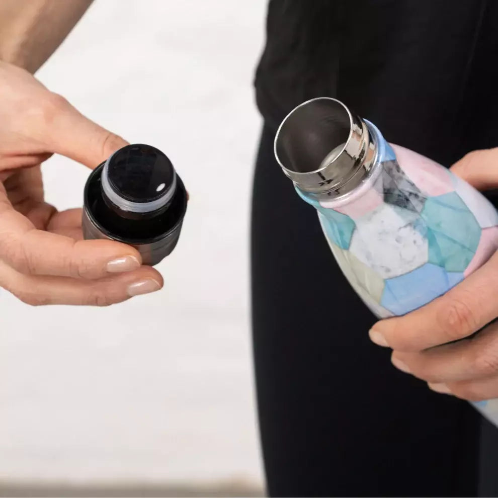 Den dubbelväggiga vakuumstrukturen håller drycken sval i upp till 24 timmar och varm i 12 timmar. Den dubbla väggen förhindrar att flaskan svettas. Innehåller inte skadlig mikroplast. En högkvalitativ silikonförsegling ser till att flaskan inte läcker i påsen. Perfekt för yoga, gym, jogging, kontor. Den stora munöppningen underlättar tvätten och den kan även passa t.ex. isbitar. Volym 500 ml. Passar perfekt i vanliga mugghållare.