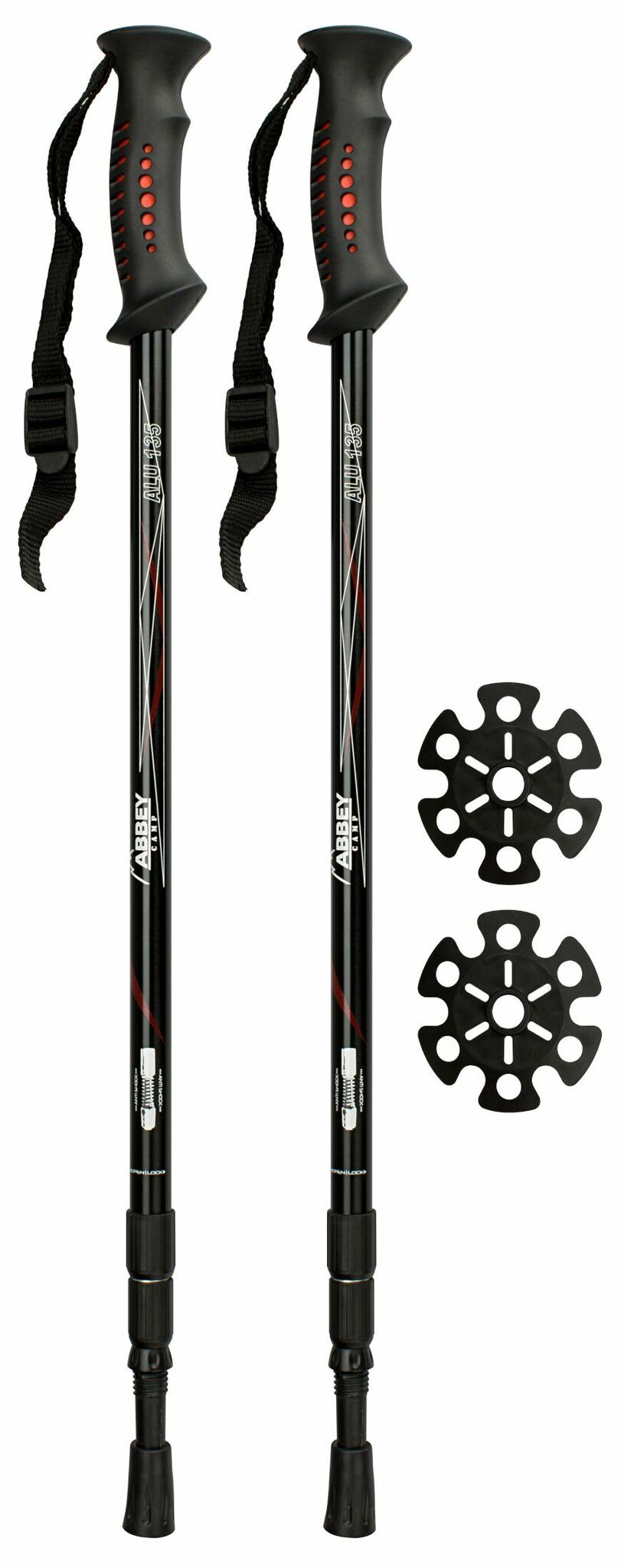 Abbeys lätta gångstavar är gjorda av aluminium. De är lätta att bära - du kan stoppa dem i en ryggsäck om du inte vill använda dem hela tiden. Längden på spöet kan justeras mellan 63 och 135 cm. Du kan hitta rätt längd för dig genom att hålla stängerna i handen, din armbåge ska vara i 90 graders vinkel när stängerna träffar marken. Gummihandtaget och det justerbara handledsremmen förbättrar handgreppet.