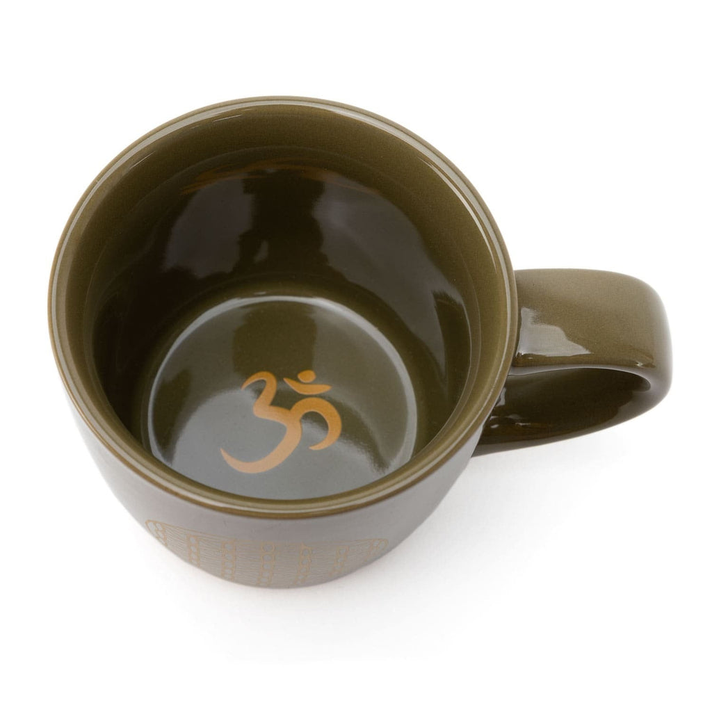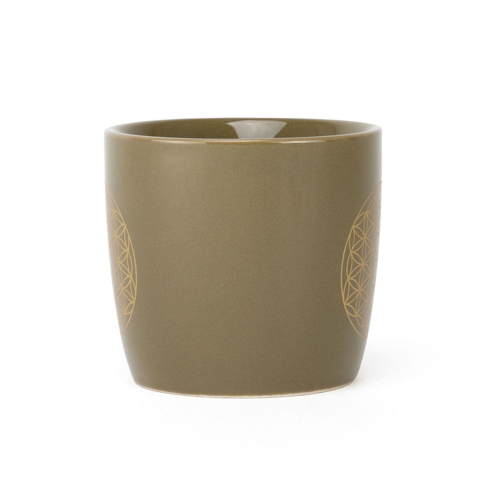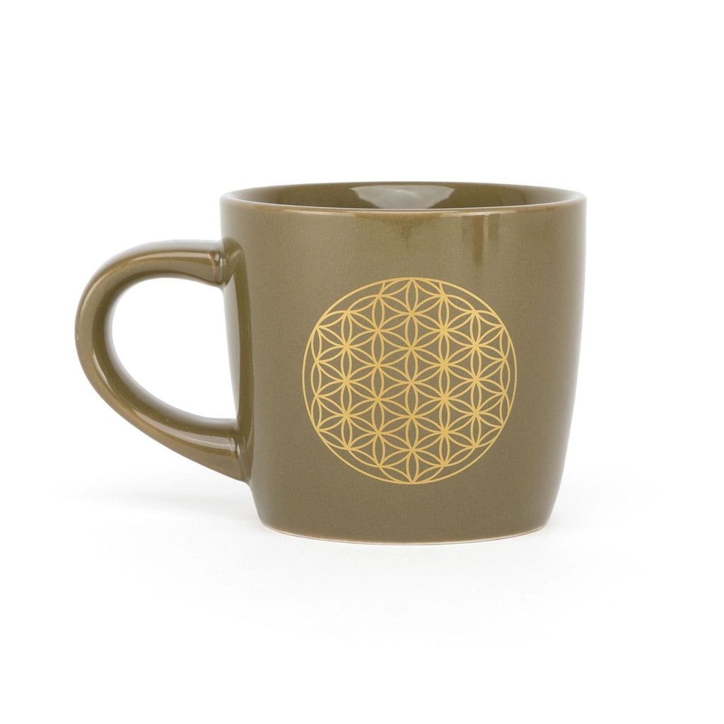 Attraktiv kaffe- eller temugg med gyllene Flower of Life-motiv. Njut av stunden - klunk för klunk. Muggfot med OM-Print. En fantastisk present till en vän eller varför inte till dig själv?