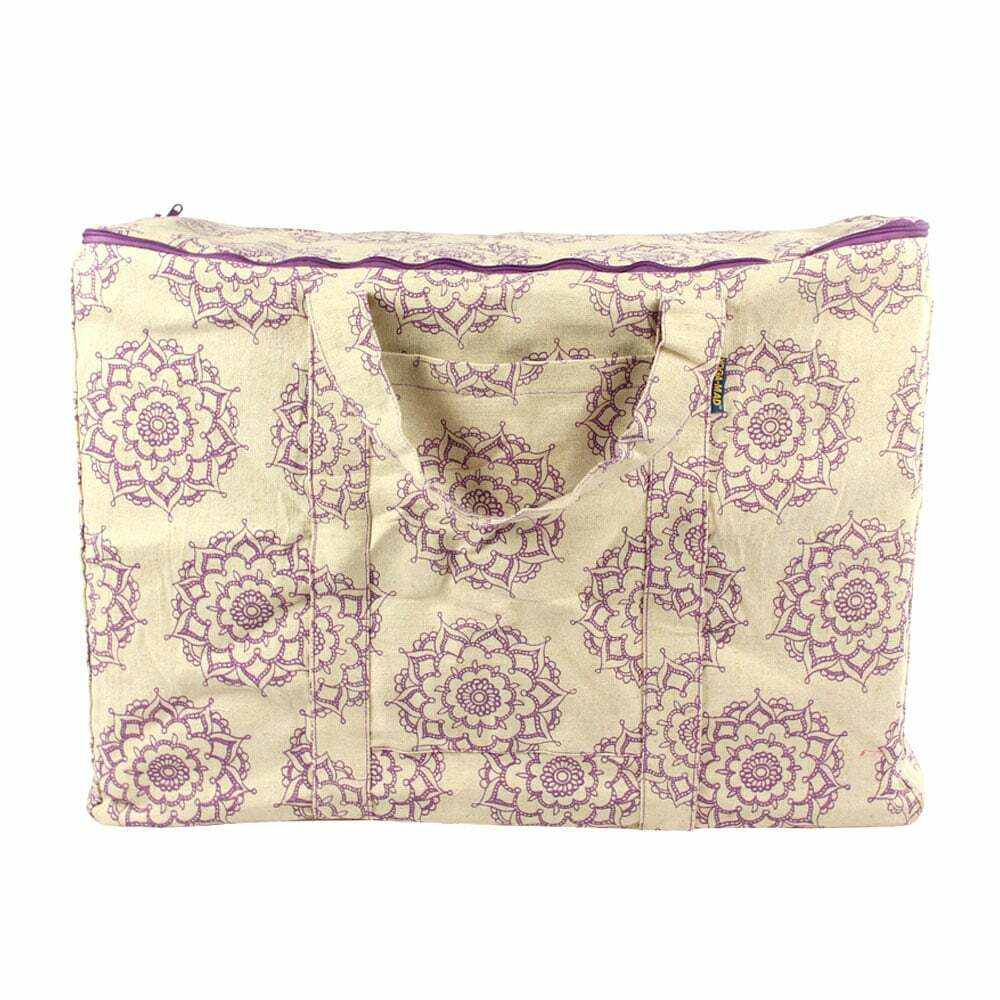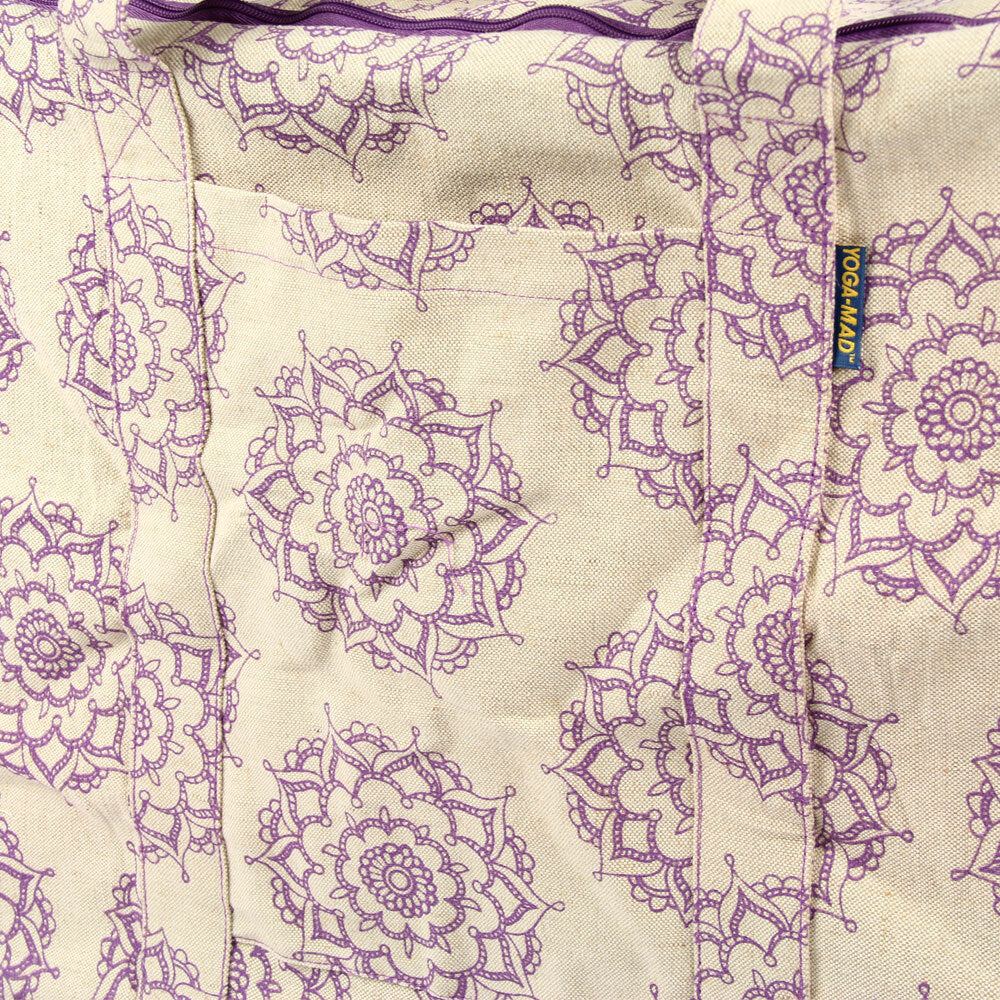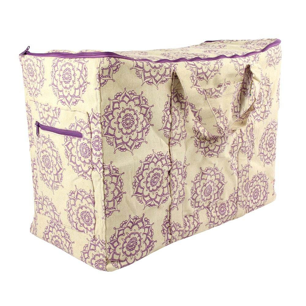 Detta är en extra stor väska som innehåller två A4-fickor för pappersarbete, en topp med dragkedja som enkelt kan stuvas undan eller tas ut och finns i den mönstrade lila mandalaen.