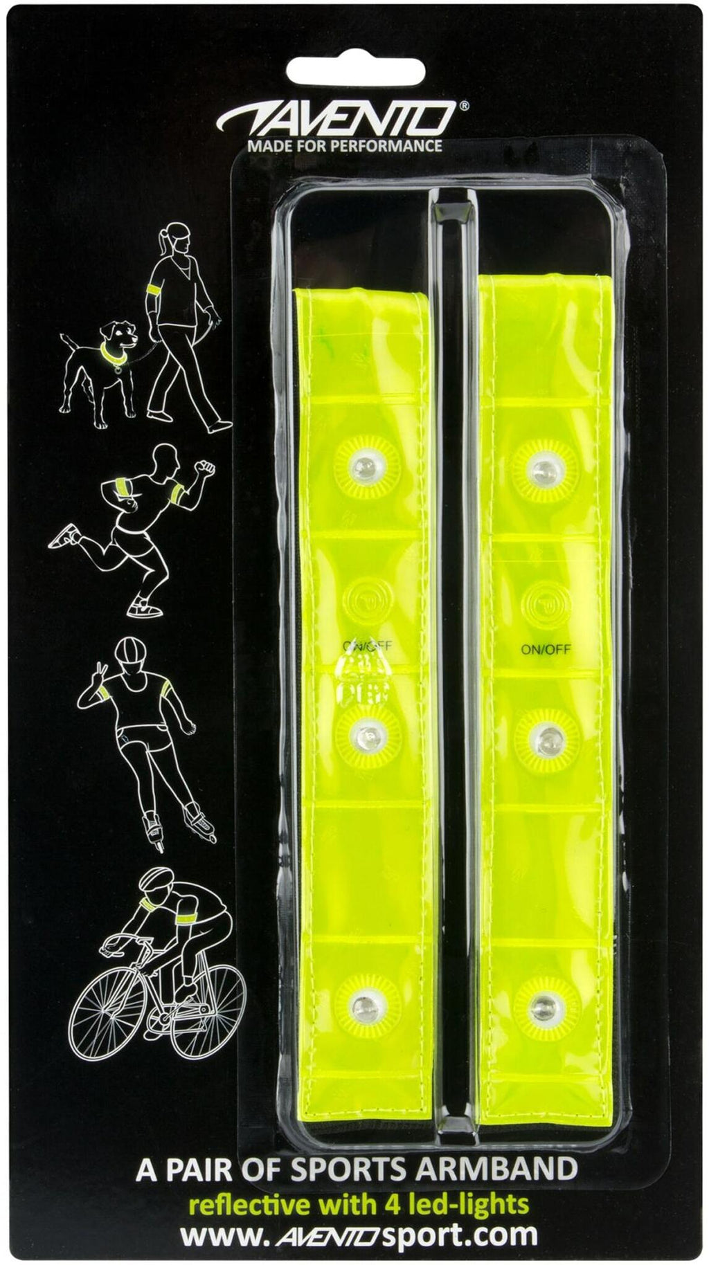 Säkerställ din synlighet för andra trafikanter. Avento-armbandet är tillverkat av reflekterande 3M Scotchlite™-material med 4 LED-lampor för extra synlighet. 2 ljusfunktioner att välja mellan, blinkande eller konstant på. Batterier ingår i paketet. Den justerbara kardborrstängningen möjliggör passform på armar i olika storlekar och håller sig väl på plats även under sport. Längden på kardborren är 21 cm och längden på den reflekterande delen är 22 cm.