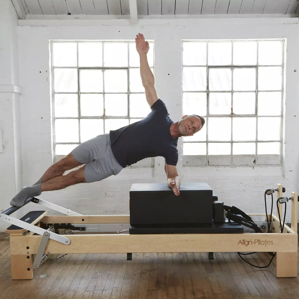 Align-Pilates M8-Pro Pilates Reformer ersätter M2-Pro reformer sommaren 2020. M8 -Pro är gjord av solid nordamerikansk lönn och är designad för att kombinera klassisk stil med modern funktionalitet. M8-Pro erbjuder förfinad prestanda samtidigt som den erbjuder omfattande justerbarhet, en lyxig överdimensionerad vagn och 104 cm färd med en mjuk och tyst körning! M8-Pro är designad för studio, rehab eller privat användning, med den innovativa designen som erbjuder en mängd enkla justeringar för att ge fullständig flexibilitet i användningen. Den principiella förändringen från M2-Pro är att M8-Pro använder vår nya patentsökta snabbväxlingsfjäderstång (RC), så fjäderstången kan justeras med fjädrarna fästa med en hand utan att behöva flytta en separat vagnsstång. Reformer levereras komplett med en löstagbar ståplattform i lönn och har nu förvaringskrok för en gondolstång och avtagbara axelstöd utanför mitten för ett urval av axelbreddspositioner. En vadderad jumpboard finns också, som är utbytbar med ståplattformen, och M8-Pro kan acceptera en Half Cadillac som konverteras till en hel platt säng med en tvådelad plattformsförlängare/madrassomvandlare.
