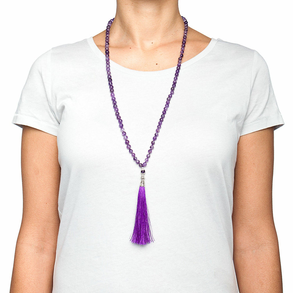 Detta vackra Mala-halsband med ametistpärlor har en lätt gnistrande look. Mala har 108 enkelknutna lila pärlor. Den är dekorerad med en lila tofs. Pärlornas diameter är ca 7 mm.