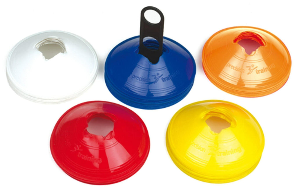 Konerna kommer i fem olika färger, vilket gör det enkelt att skilja olika gränser från varandra och fokusera på spelet. De livfulla färgerna är tydligt synliga från en mängd olika plattformar. Lämplig för inomhus och utomhus. Setet innehåller 50 koner och ett praktiskt stativ som skivorna är lätta att stapla på. Kottens diameter 20 cm, höjden 5 cm.
