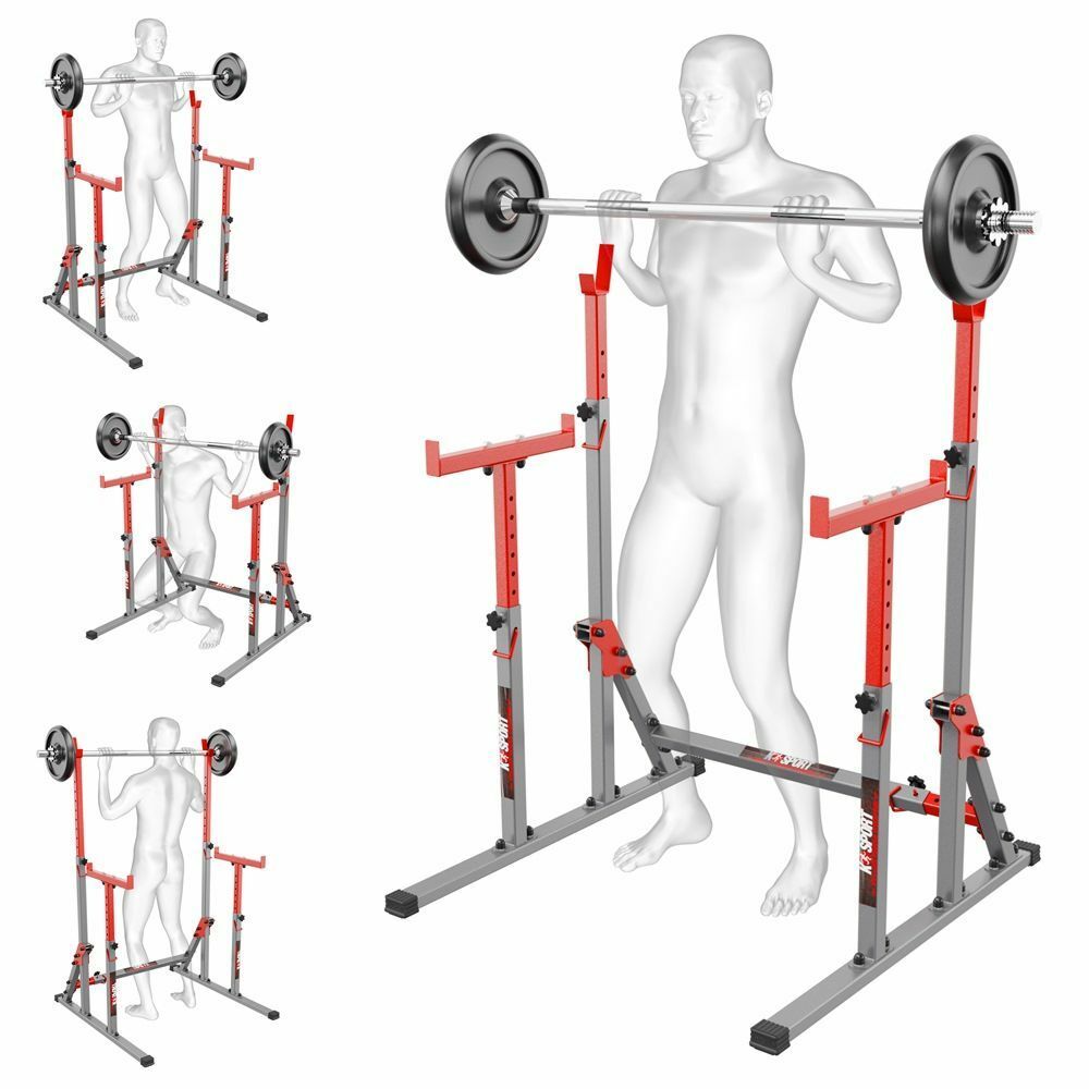 Om du vill behålla squatsiffrorna i ryggen, fronten och knäböj över huvudet, är den enklaste lösningen att investera i en knäböj hemma kuggstång. Med detta rack kan du träna knäböj fram, knäböj bak, pull-ups, marklyft och mycket mer! Med en justerbar bänk kommer du också att kunna använd squatstället för bänkpress och motståndsbandsarbete. Justerbara säkerhetsjärn möjliggör säker träning ensam i alla rörelser. Förutom de vertikalt justerbara stängerna kan du justera stativets bredd mellan 80 och 125 cm. Hyllans olika lägen är låsta med säkerhetslås. Det finns gummiskydd under benen och alla bultändar är skyddade med plastlock.