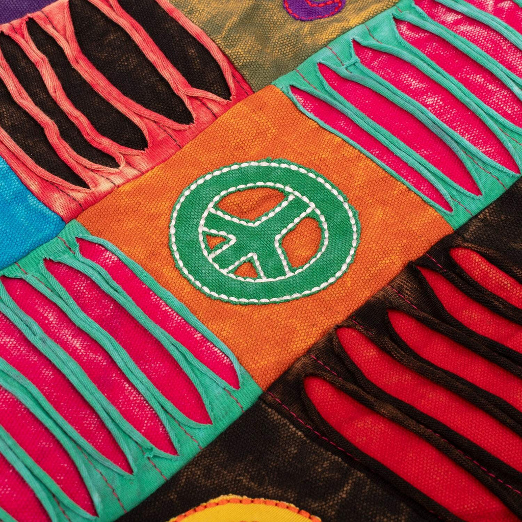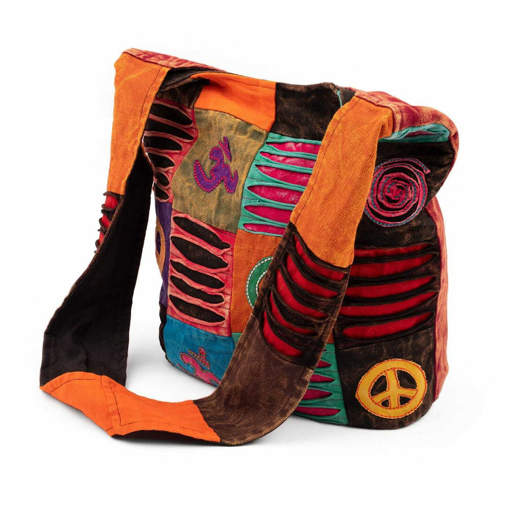 Den färgglada hippieväskan "Om Shanti Bag" kommer garanterat att få dig i semesterstämning! Goa-väskan i lapptäcksstil är gjord av olika färgade tyger och finns i grundfärgerna orange och brunt. Baksidan av väskan är roströd. Axelväskan är dekorerad med mönster som Peace-tecknet eller OM-symbolen.