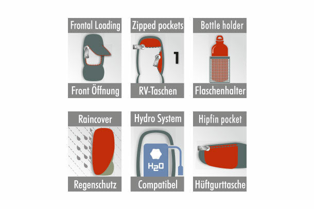 Ryggsäcken har ett stort fack och en lockficka med dragkedja på toppen. Meshfickor för dricksflaskor på båda sidor. Ryggsäcken är också kompatibel med de flesta hydreringsblåsor.