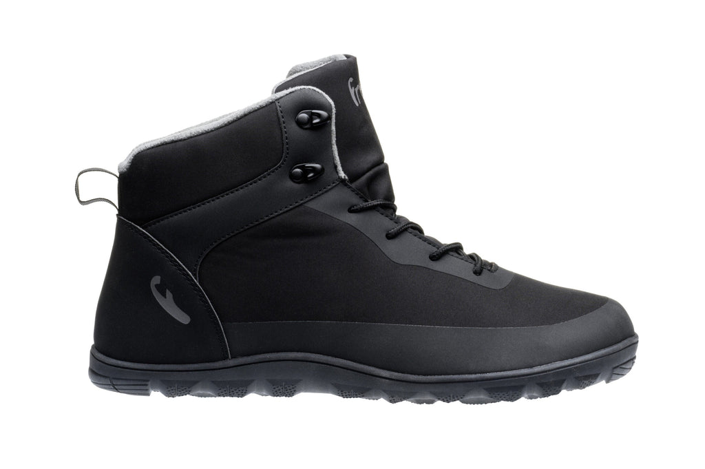 Arkens barfotasko är lämplig för utomhusaktiviteter, camping, sport eller urban användning. Skon har en bred läst som vanligt för barfotaskor och en tunn och smidig yttersula. Det ankellånga skaftet håller snö och slask borta från skorna, och ytan av återvunnet BottleYarn-material stöter bort vatten, så att tårna inte blir blöta i små pölar. Varm mikrofleece heltäckande foder med ett vattentätt membran som andas. Den stötdämpande Ortholite-innersulan (3 mm) och den tunna men mycket greppvänliga TrailGrip-sulan garanterar en utmärkt barfotaupplevelse på vintern.