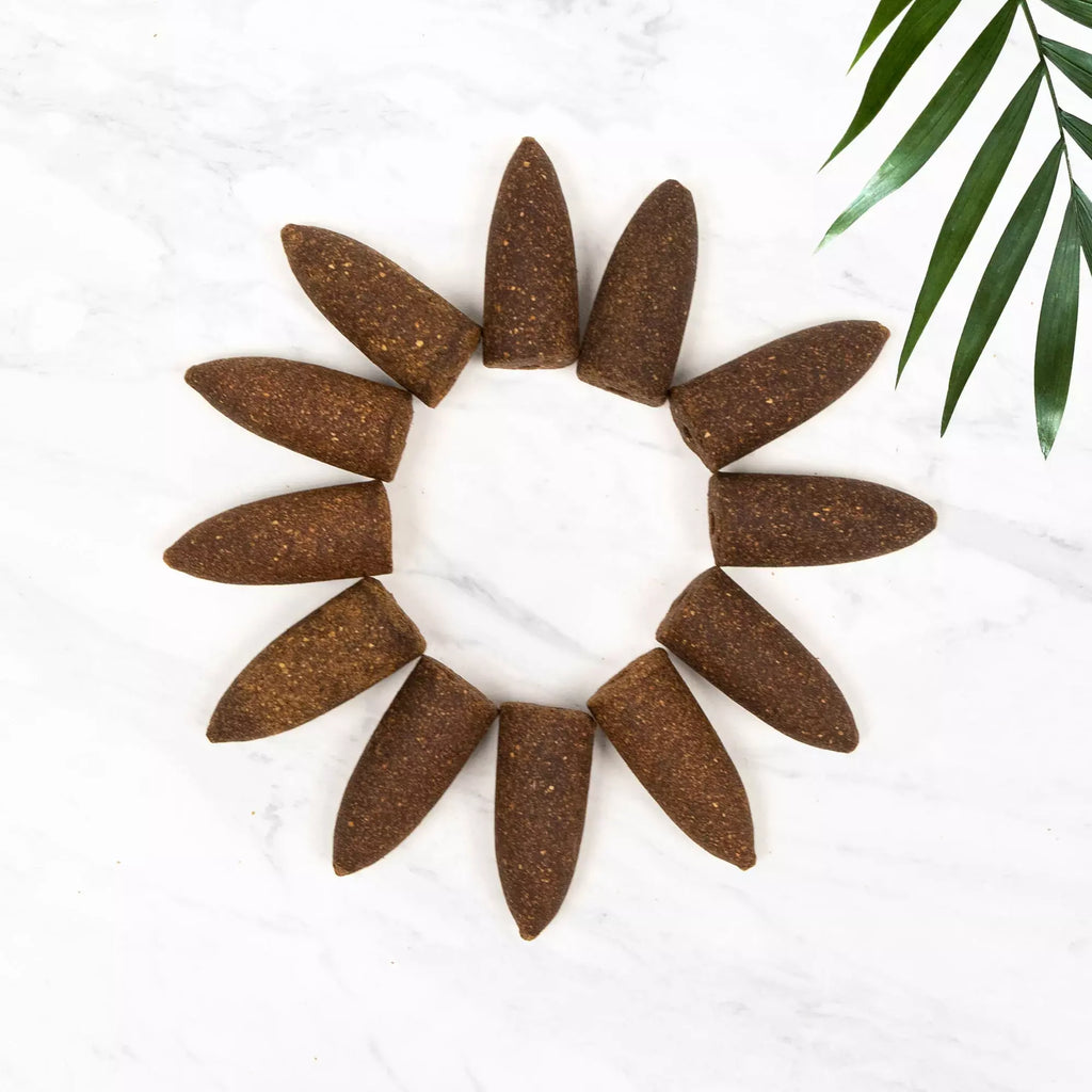 Användning: Bränn rökelse på en icke brandfarlig bas som är lämplig för ändamålet. Tänd konen från spetsen och låt lågan brinna i några sekunder innan du försiktigt blåser ut den. Lämna inte rökelse utan uppsikt. Stäng av den genom att trycka den mot en värmebeständig yta. Ventilera rummet efter att du har bränt rökelse.