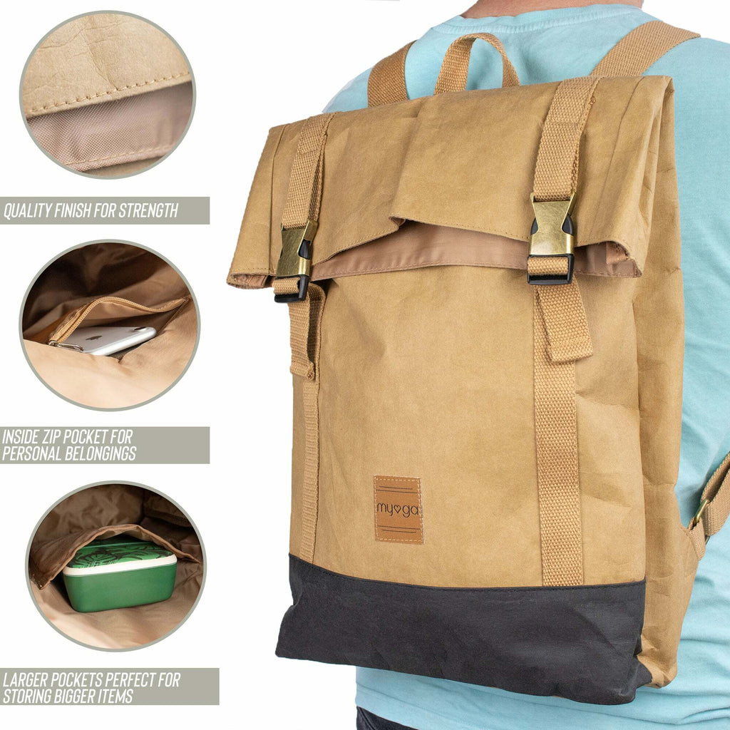 Ryggsäcken är gjord av pappersfiber, som snurras och knyts till en pappersduk. Trots sitt lätta utseende är ryggsäcken mycket hållbar.