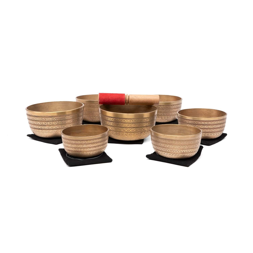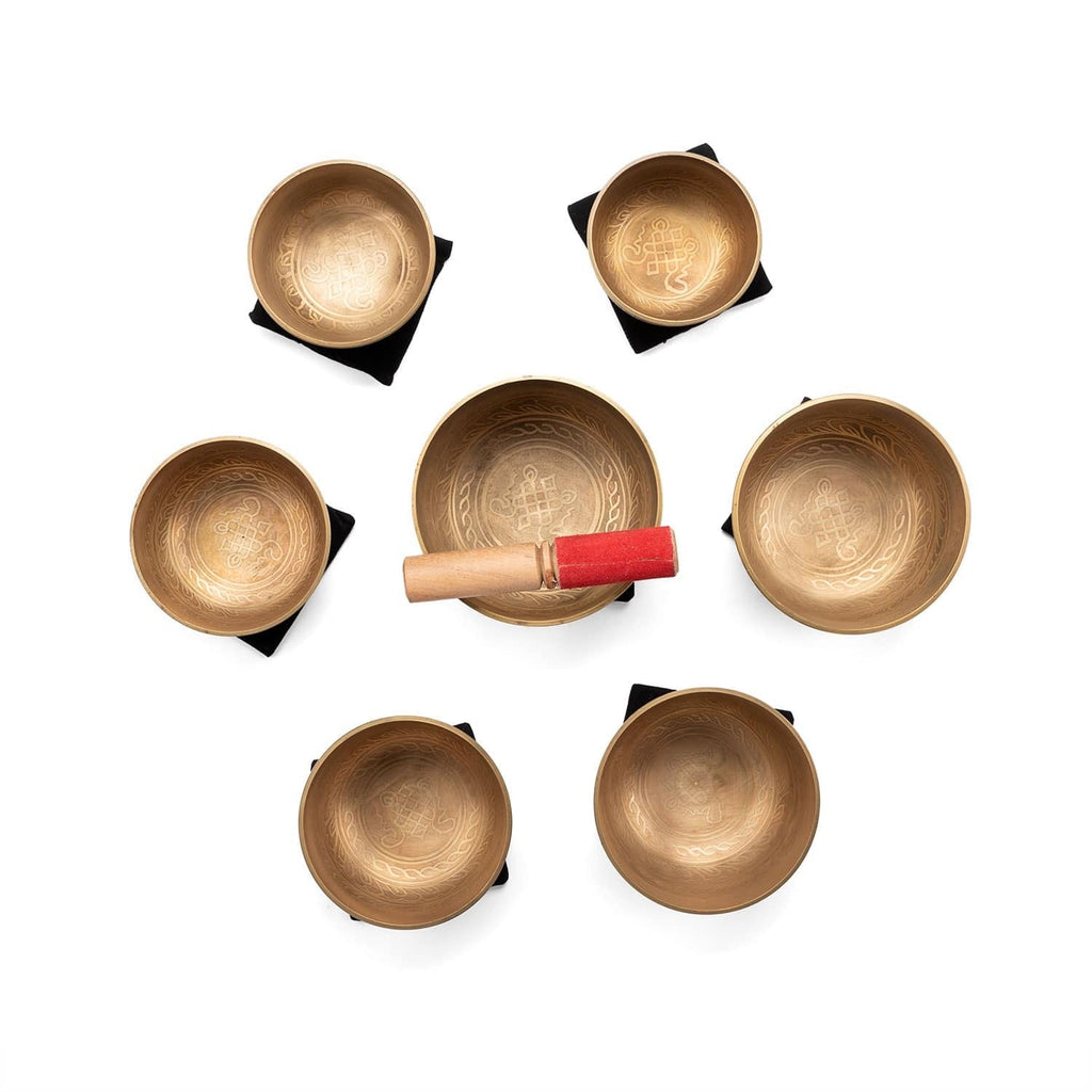 Det tibetanska sångskålssetet består av sju olika storlekar sångskålar som kan staplas inuti varandra. De "drivs" gradvis större med hjälp av hammare från ett stort gjutblock tills de har nått sin slutliga form. Skålarna är vackert graverade på både insidan och utsidan. Sångskålarna är handgjorda i Indien enligt tibetansk modell.