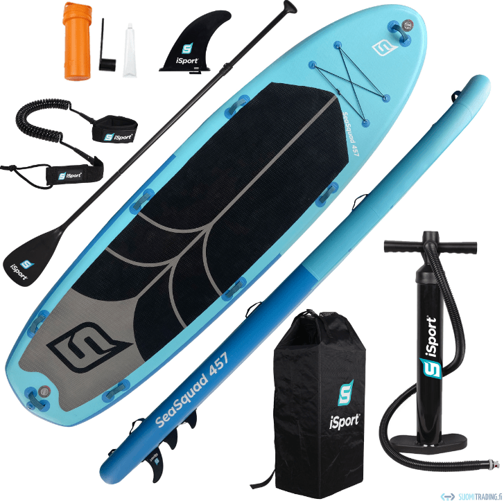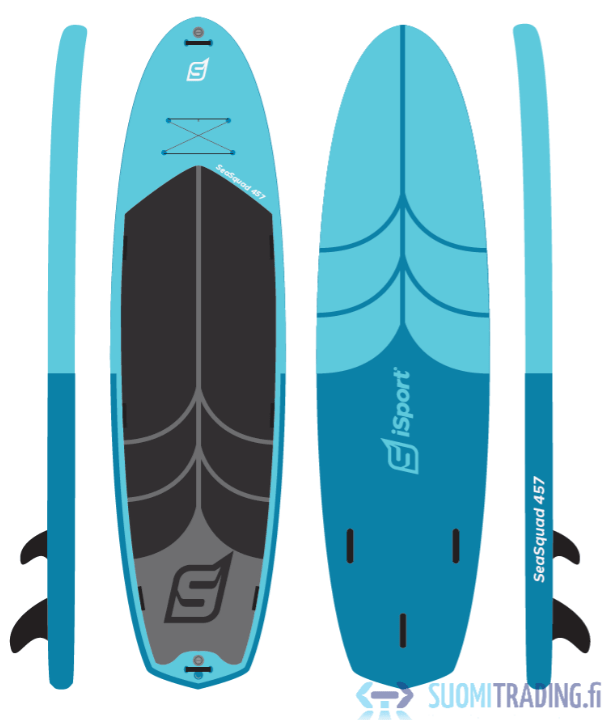iSport SeaSquad SUP-brädan är över 4,5 m lång och kan bära 6-8 personer åt gången. Lastkapaciteten är hela 500 kg. Brädan har en Dropstitch-kärna vilket gör brädan mycket stabil, robust och hållbar. Längst ner finns 3 löstagbara fenor som balanserar passagen av brädan. Däckmaterialet är fast och halkfritt. Gummiband på framsidan för att bära små föremål som en vattenflaska. En runaway rem kan fästas på baksidan av brädan, vilket ökar säkerheten om du ramlar av brädan. Främre och bakre bärhandtag.