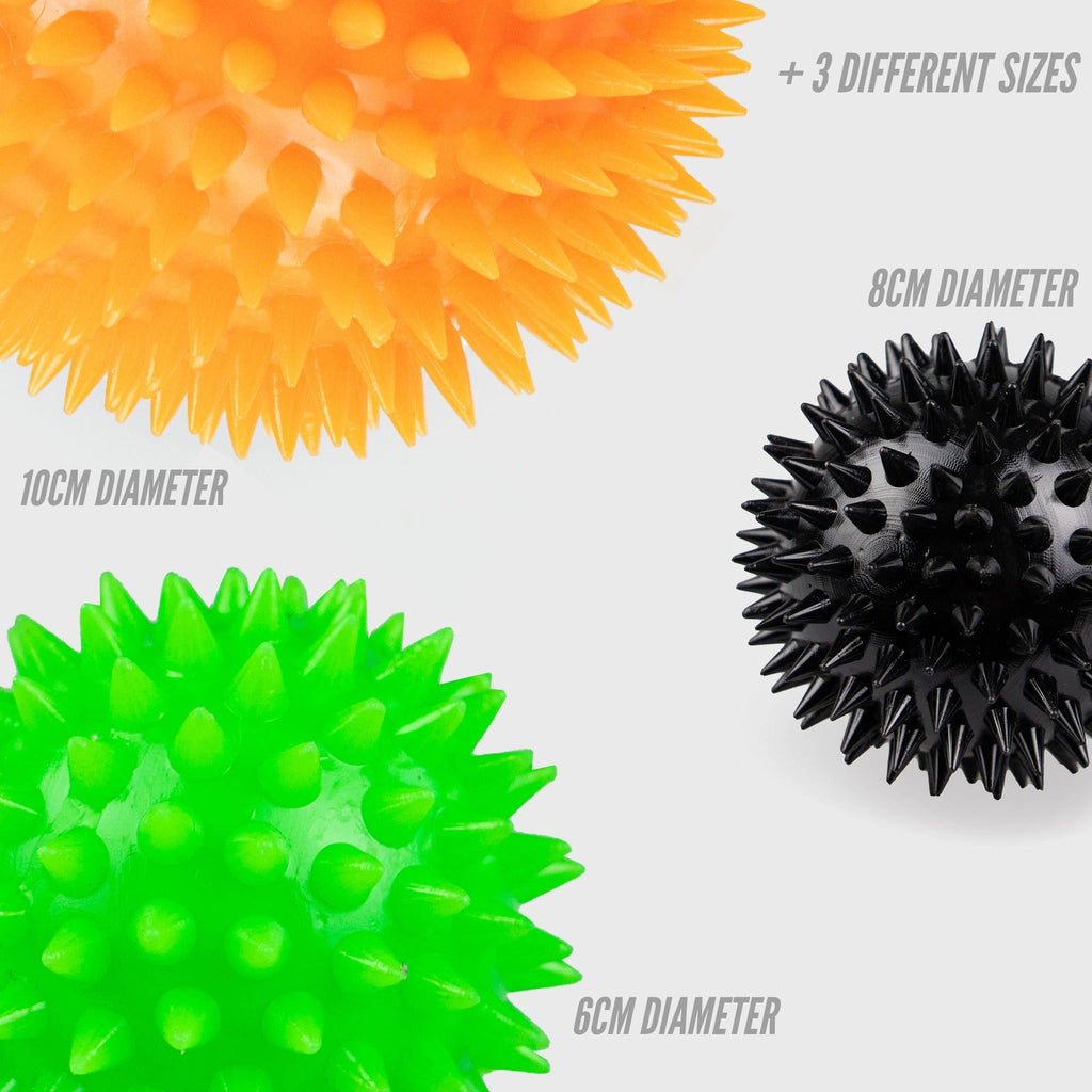 Med spikarna på fasciabollen kan du enkelt hitta ömma ställen i kroppen och fokusera massagen på exakt rätt punkt. Den spetsiga bollen stimulerar blodcirkulationen, lindrar muskelspänningar och hjälper till att avlägsna gifter från kroppen. Regelbunden massage kommer att hålla dina muskler mjuka, förbättra rörlighet och flexibilitet. Individuella storlekar är speciellt utformade för att rikta in sig på olika delar av kroppen. Lämplig att använda på t.ex. fotsulor, rygg, lår och nacke. Massagebollar kan användas före eller efter träning. De lätta massagebollarna är lätta att ha med sig i träningsväskan. Kulorna är gjorda av PVC, som tål kroppsvikt.