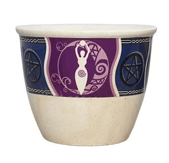 Keramikskål för att bränna fläckig rökelse. Skålen är illustrerad med mångudinnans symbol.