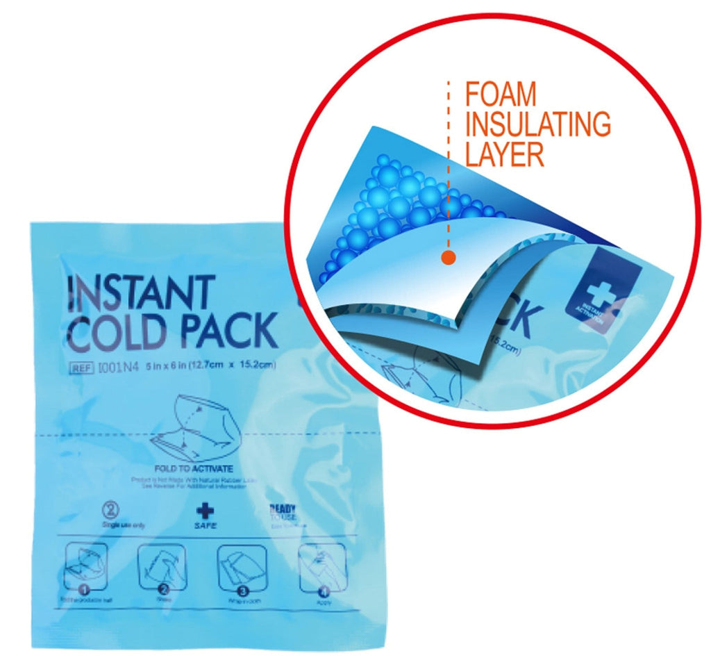 Ett engångskylpaket är ett första hjälpen-verktyg som alla borde ha hemma såväl som i en gymväska. Förkylningsbehandling påbörjad direkt efter en olycka lindrar smärta och svullnad vid de flesta stukningar, fall, frakturer och andra knölar. Den färdiga kylförpackningen aktiveras genom att vika den på mitten. Skaka påsen för att frigöra sin fulla kraft. Kylpacken har ett isolerat lager av skum som förhindrar köldskador. Lägg den inte direkt på såret.
