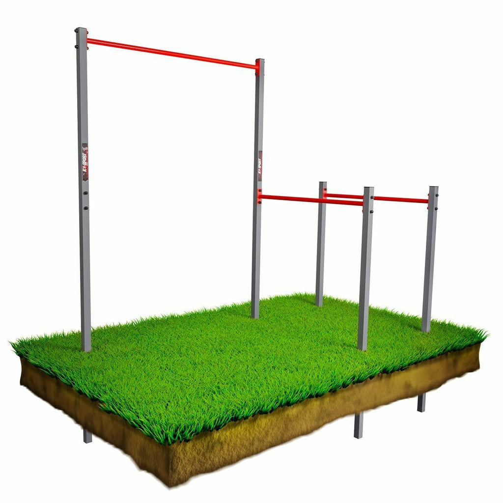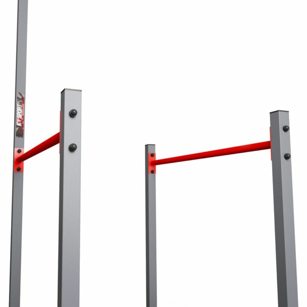 Njut av den friska utomhusluften när du tränar styrka och flexibilitet med en mängd olika kroppsviktsrörelser. I gymmet ingår förutom barer på olika nivåer en krok för en boxningssäck. Till exempel TRX-remmar, motståndsgummiband eller andra tillbehör är lätta att fästa på toppstången. På räckena kan du träna skjutrörelser samt gymnastiktrick och stretch. De breda stängerna har tillräckligt med utrymme och hållbarhet för alla övningar du kan tänka dig.