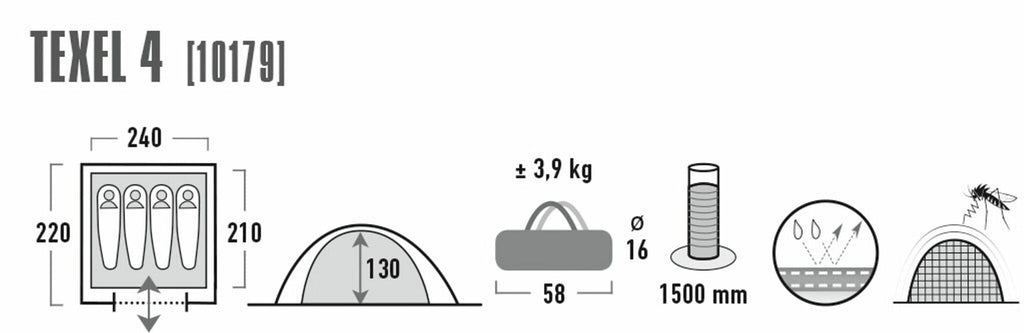 Kupoltältet förblir upprätt av sig självt tack vare de korsande bågarna. Den kan byggas på nästan vilken plan yta som helst, eftersom kilarna inte nödvändigtvis behöver tryckas ner i marken. Texeltältet är lämpligt för 4 vuxna. Storlek 250 x 220 x 135 cm. Tältets yttermaterial är tillverkat av PU-behandlad 190T polyester med tejpade sömmar. Vattentät 1500 mm. Golv av vattentät PE-plast. Håller dig och dina tillhörigheter torra även i regn! Valv av glasfiber.