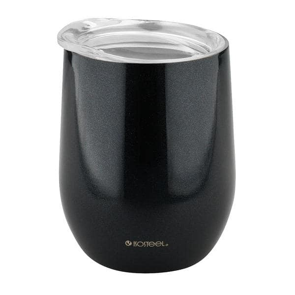 En termoskopp i rostfritt stål med drickslock håller dryckerna kalla eller varma.