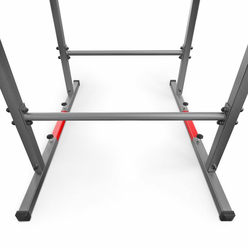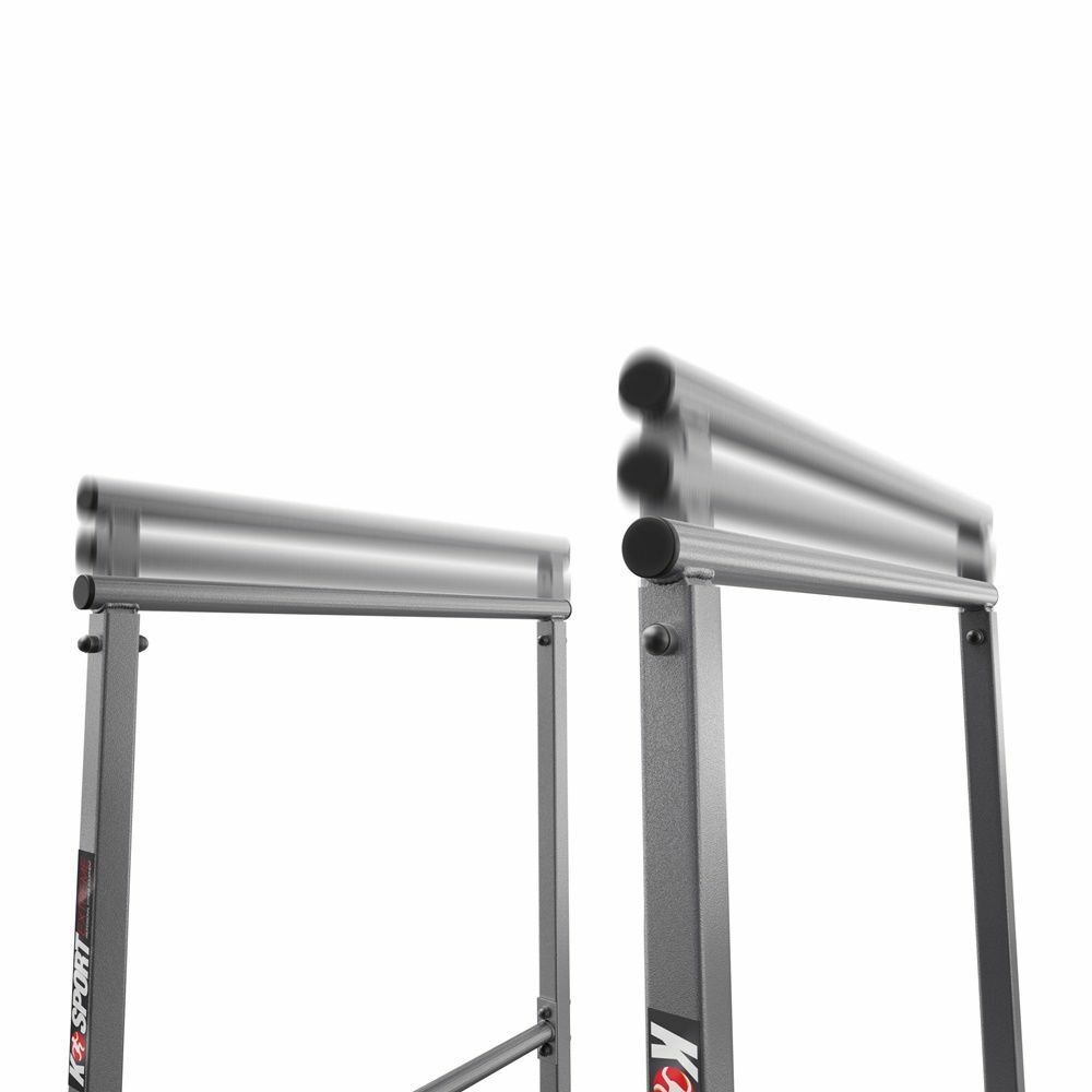 Den stadigt formade foten ser till att stativet sitter säkert och håller sig upprätt i alla rörelser. Den maximala belastningen på det extremt tåliga stället är upp till 290 kg. Höjden på räckena och avståndet mellan räckena kan justeras till lämplig höjd för varje rörelse. Stativet är tillverkat av pulverlackerat stål, så det är lämpligt för både inomhus- och utomhusbruk.