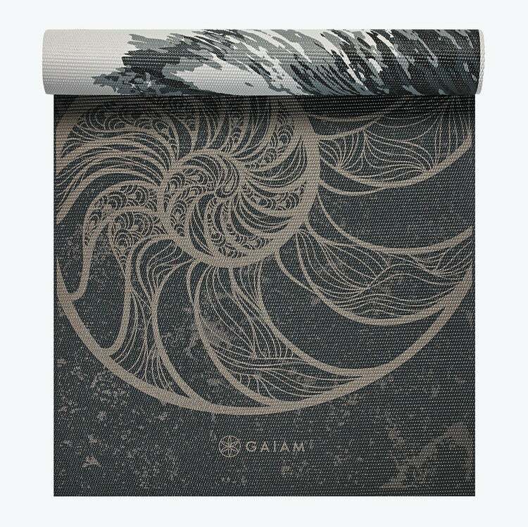 På ena sidan finns ett kraftigt flodvågstryck och på den andra ett lugnare snäckskalsmönster. Båda sidorna av mattan har samma grepp, så du kan använda varje sida uppåt beroende på dagens humör.