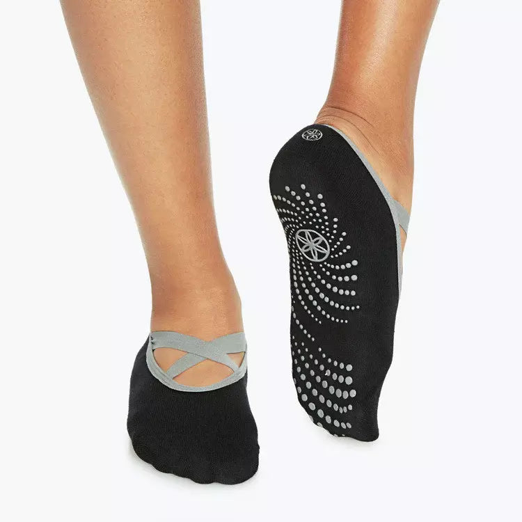 Strumpor skyddar dina fötter från smuts och bakterier, håller dig varm på kalla golv och ger ett bättre grepp för träning. Tack vare greppstrumpor kan yogaövningen även utföras utan yogamatta vid behov. Strumporna har en design inspirerad av balett. Korsade gummiband på vristen ser till att sockarna sitter stadigt på foten. Material som andas. "Normal" modell, dvs. inte en tåstrumpa.